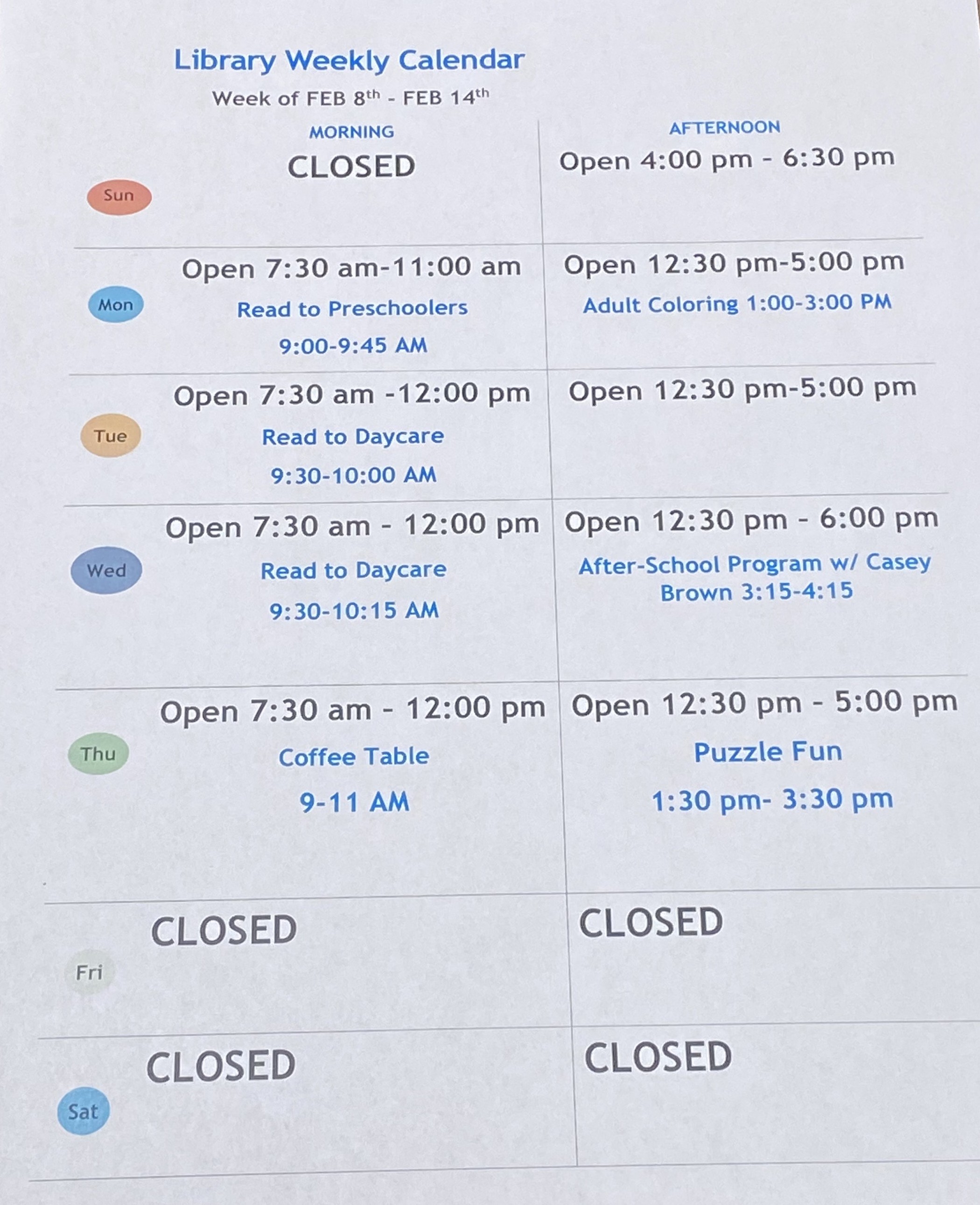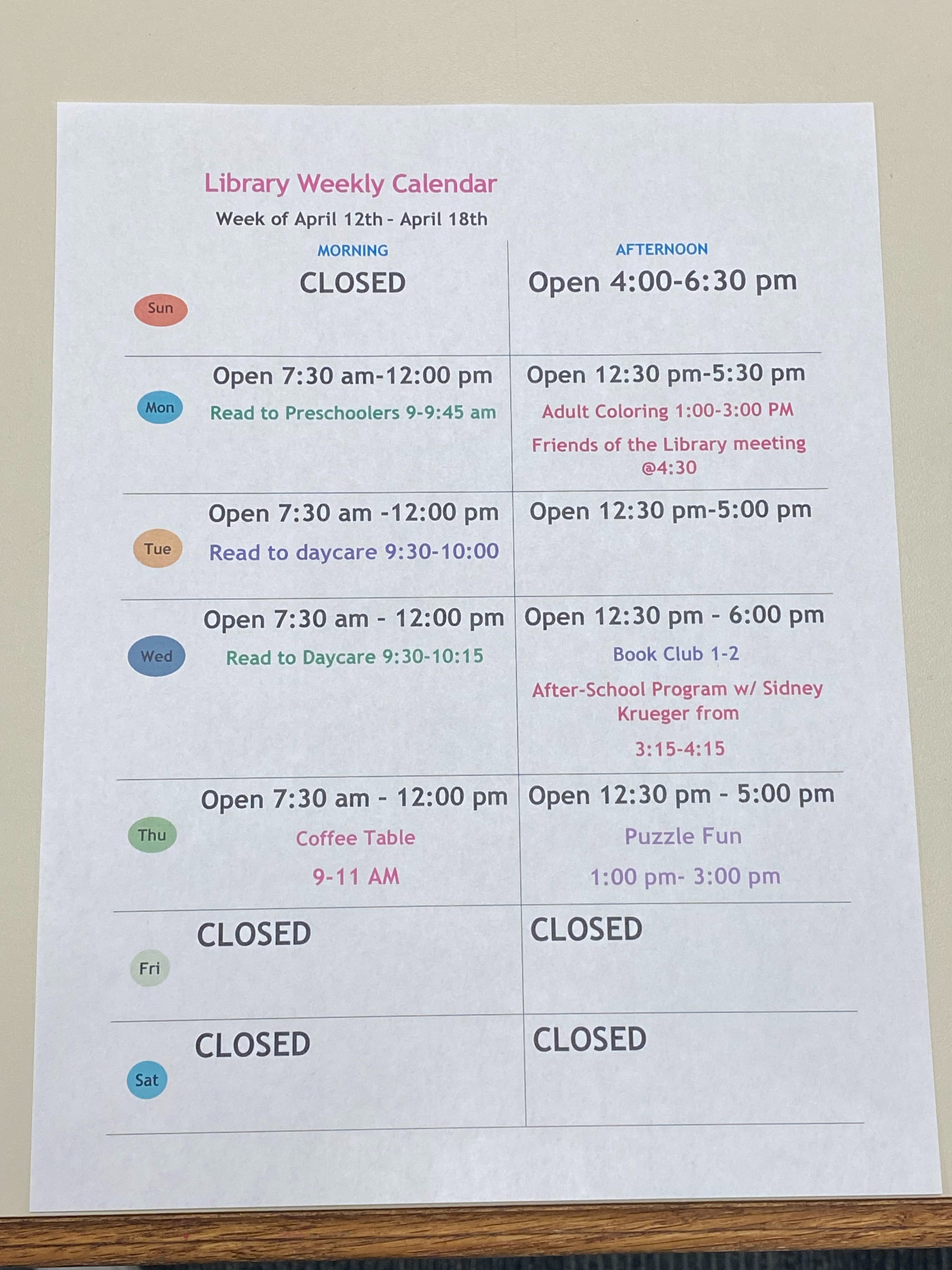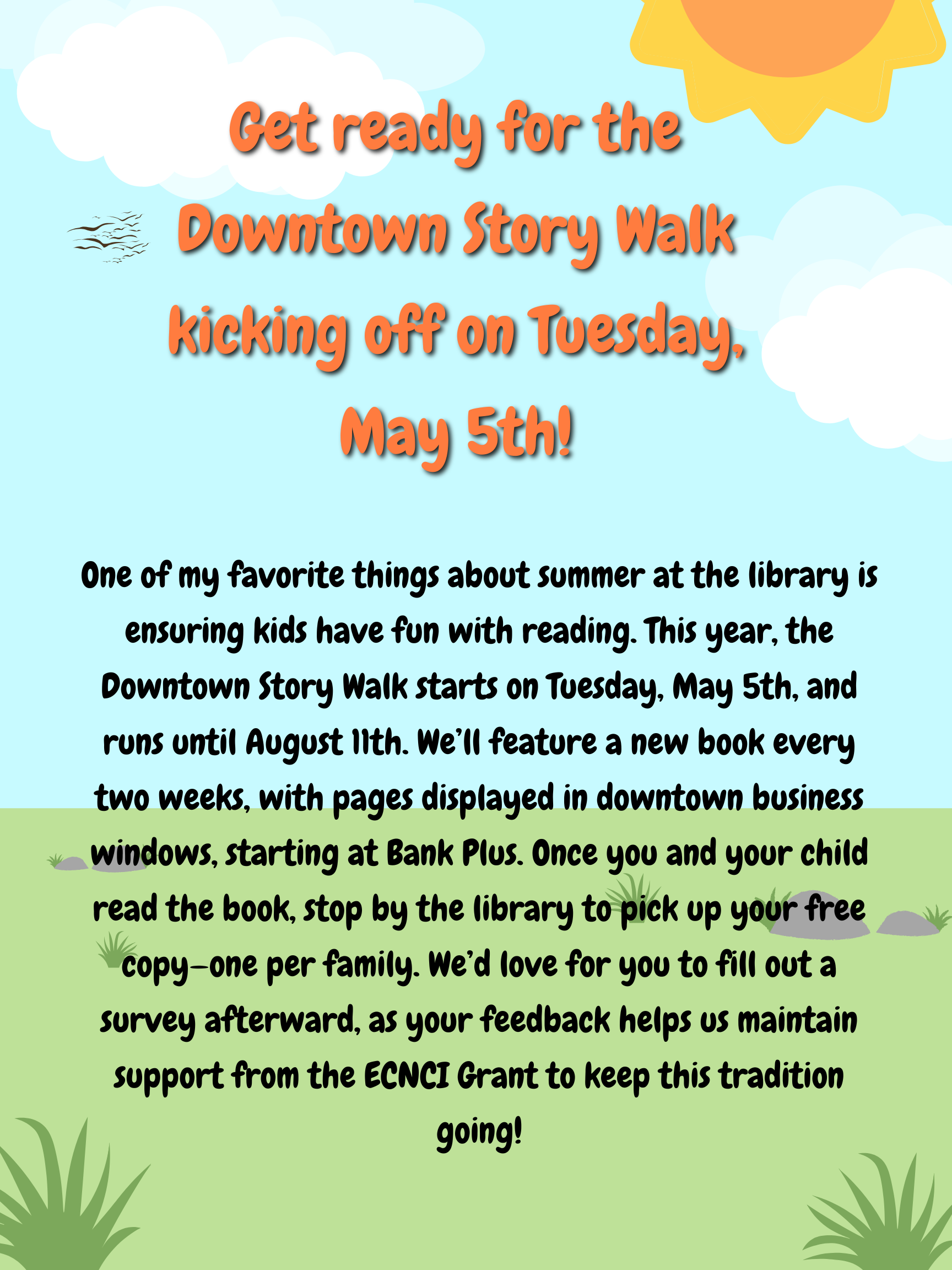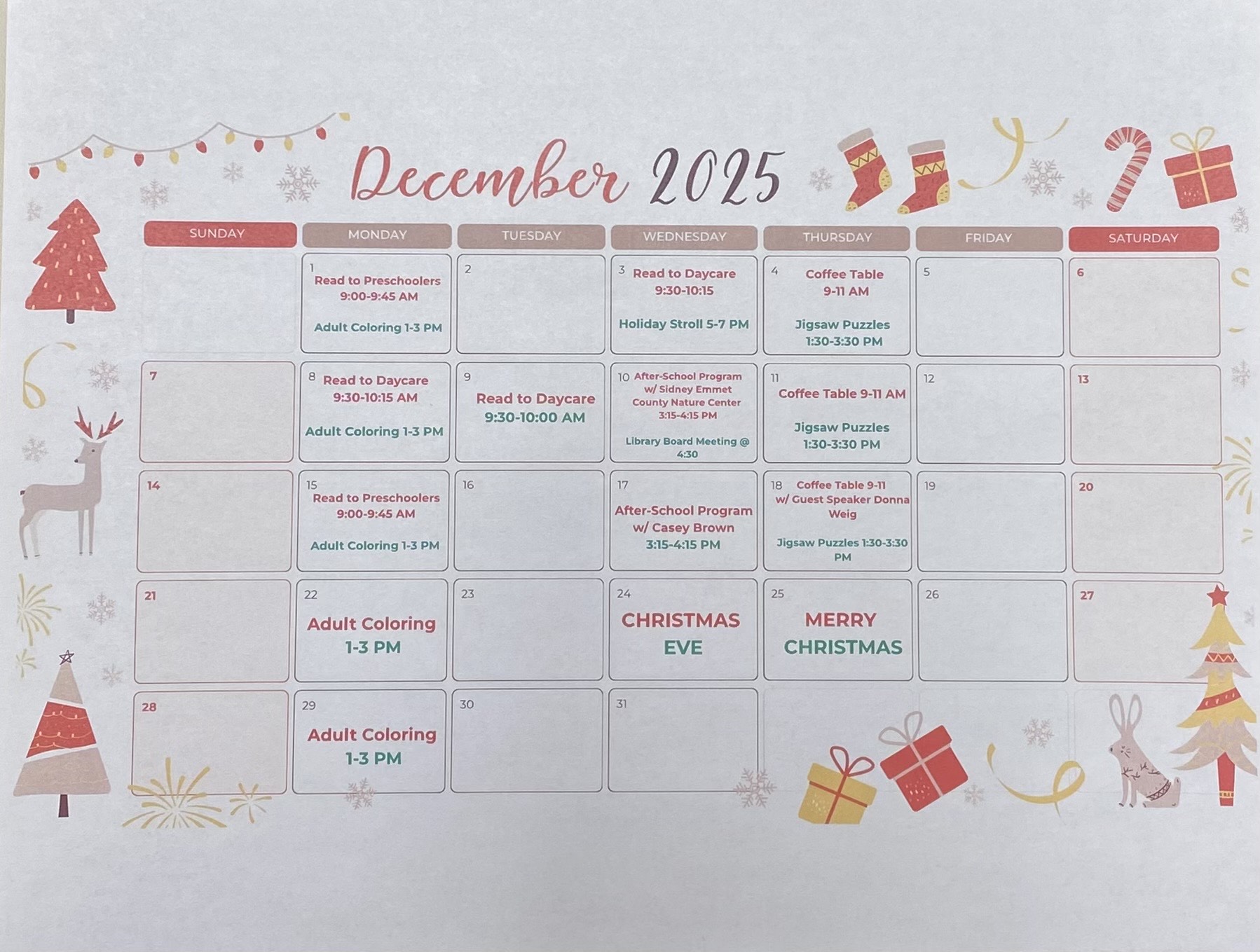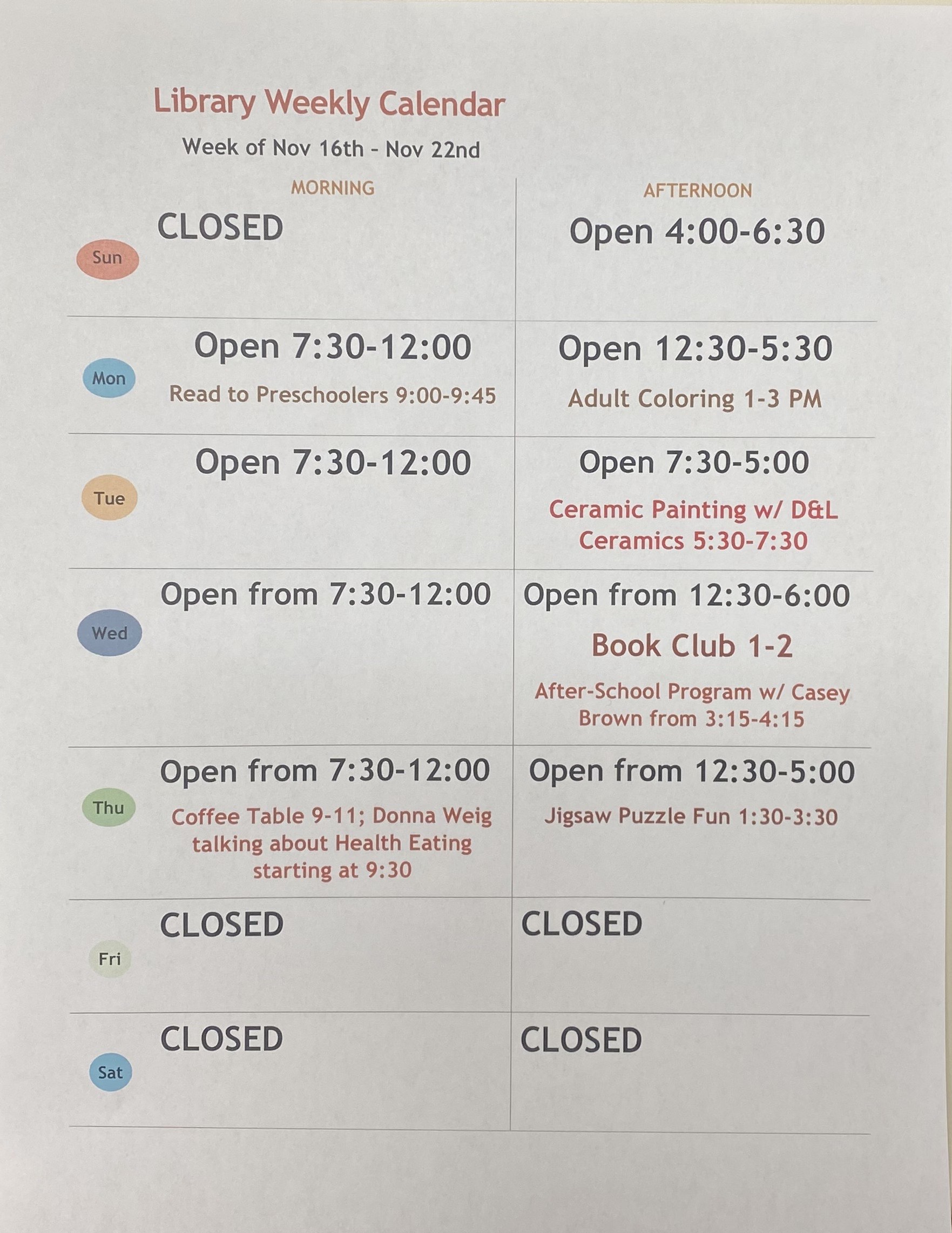 If you have questions, feel free to call the library anytime. Don’t forget to visit our Facebook page, website, or the front door for the latest library hours and updates. We can’t wait to see you!