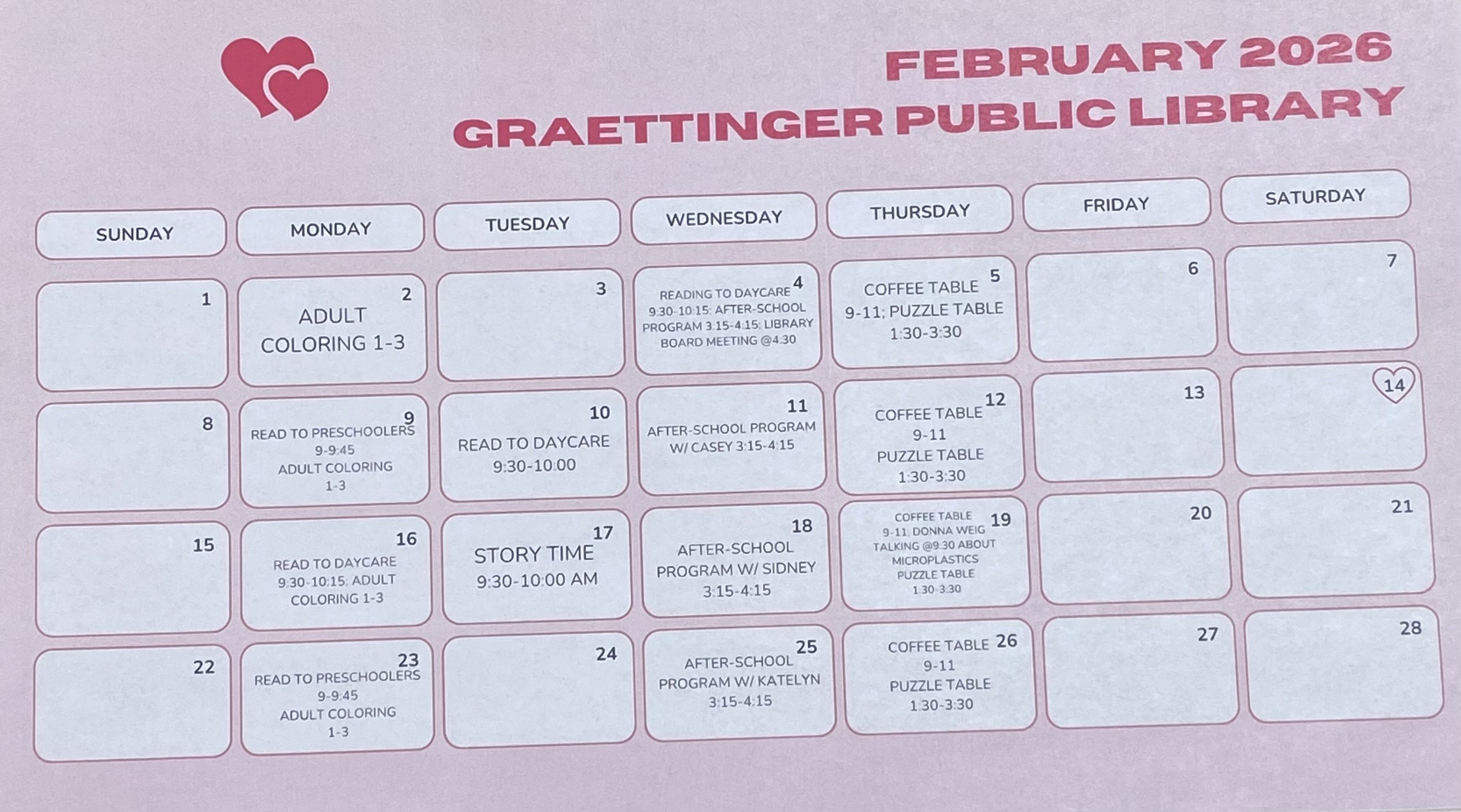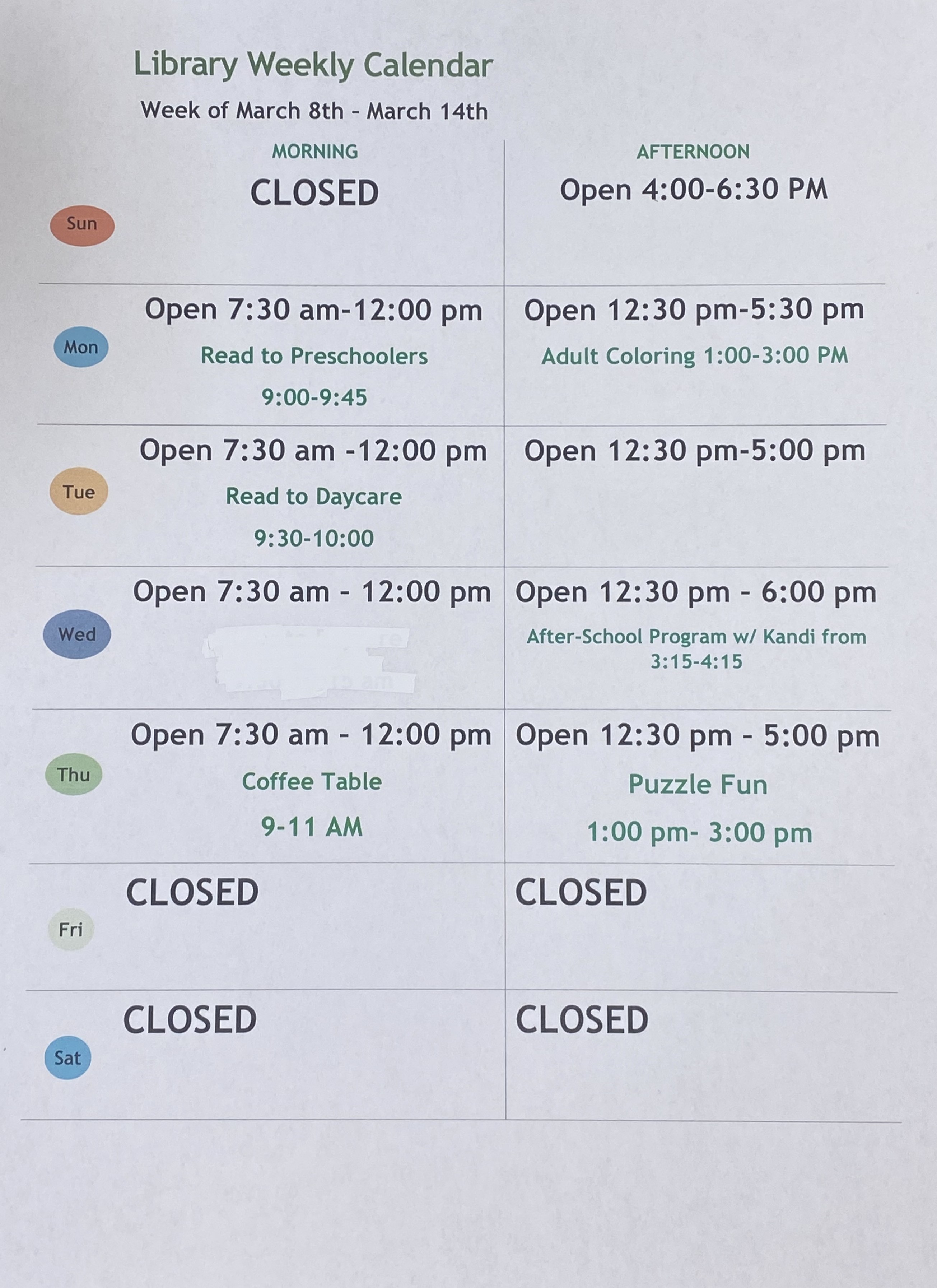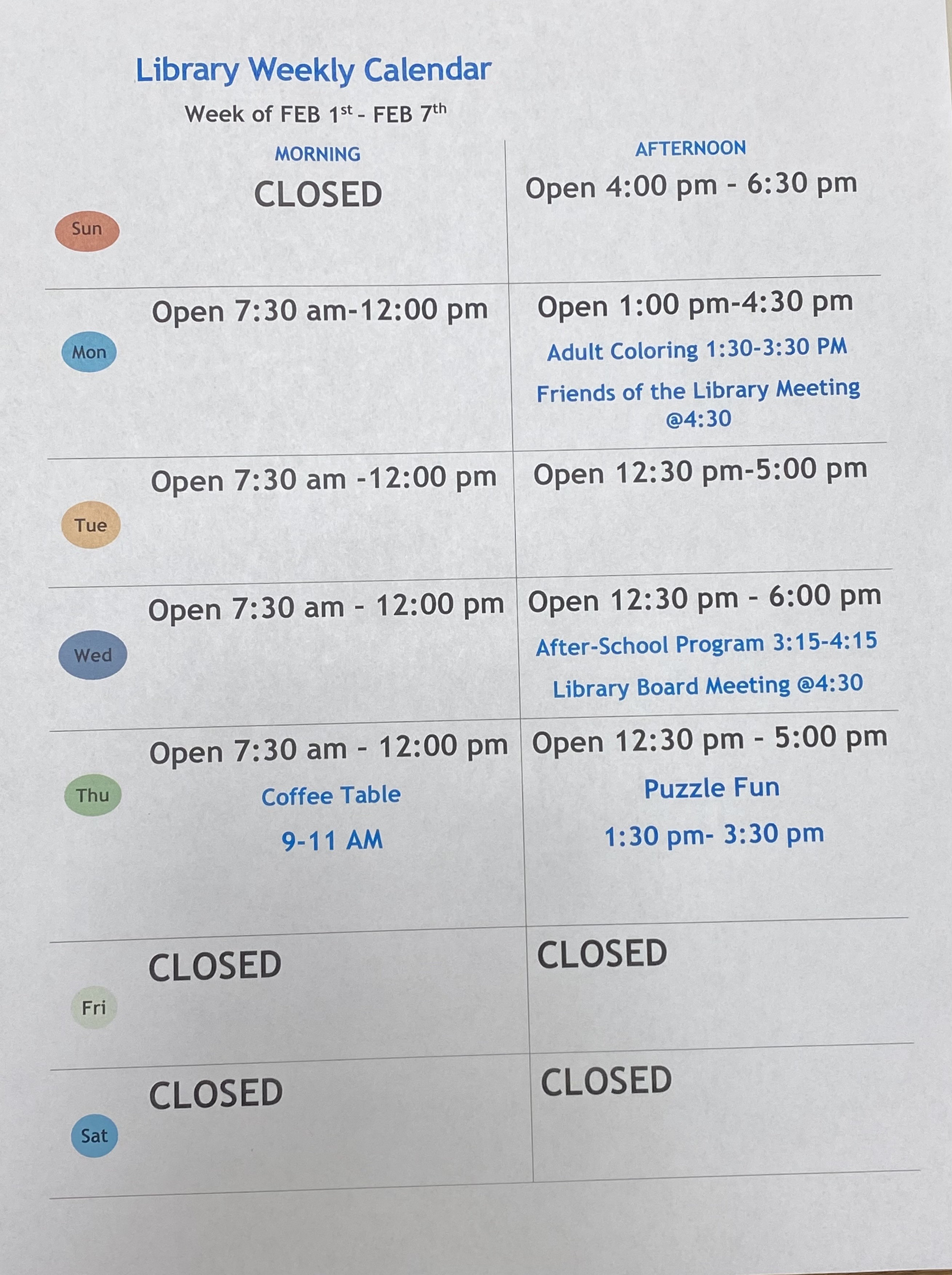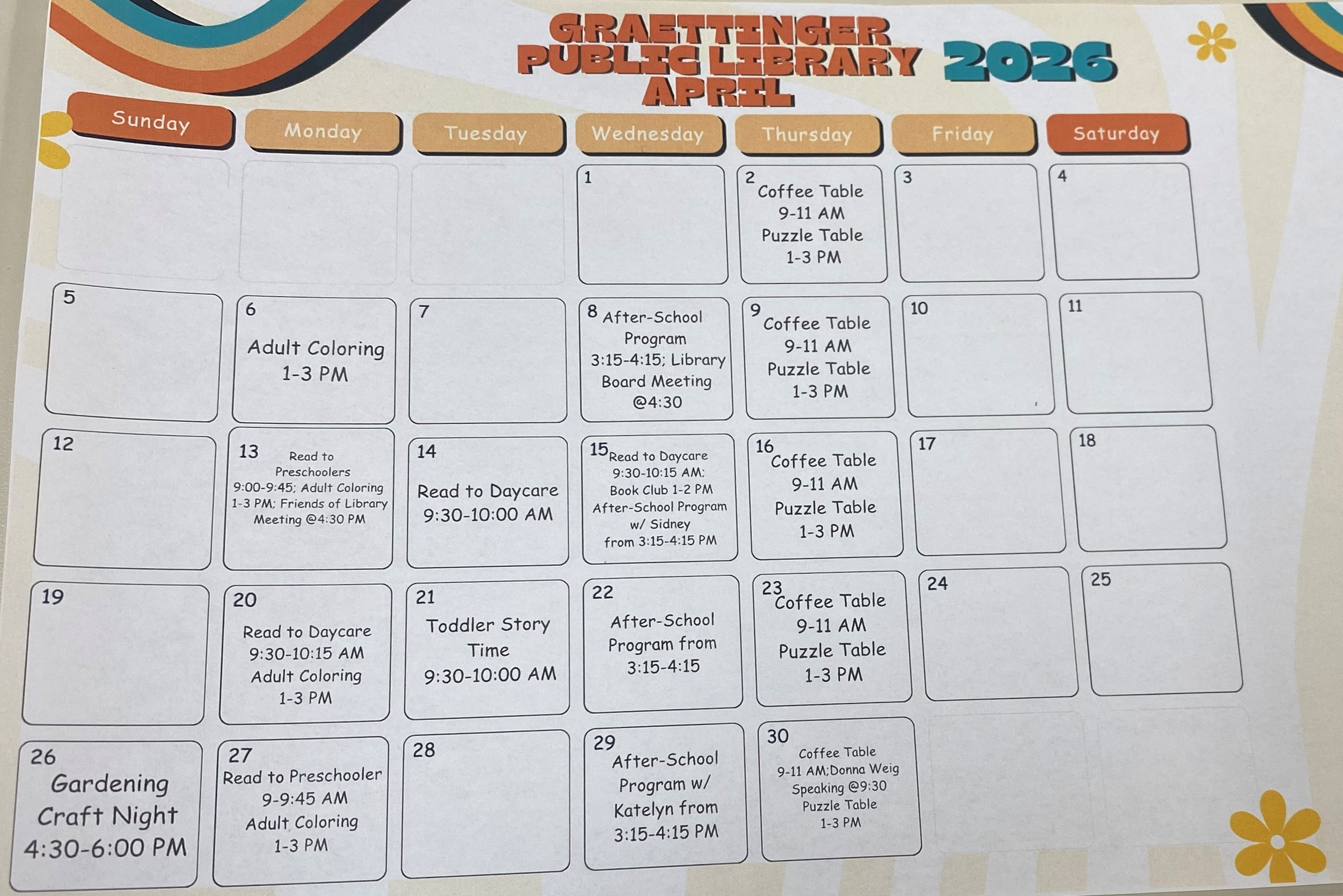If you have questions, feel free to call the library anytime. Don’t forget to visit our Facebook page, website, or the front door for the latest library hours and updates. We can’t wait to see you!