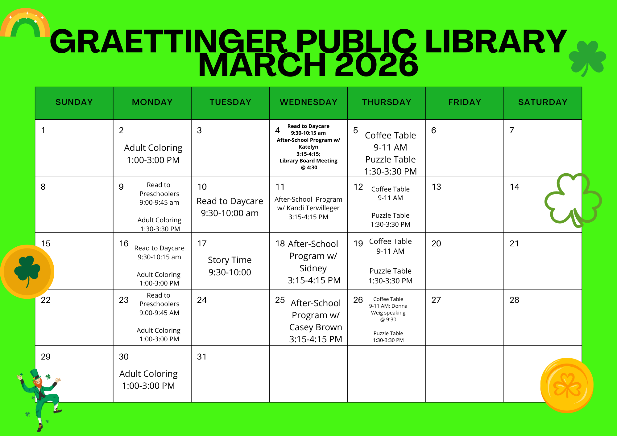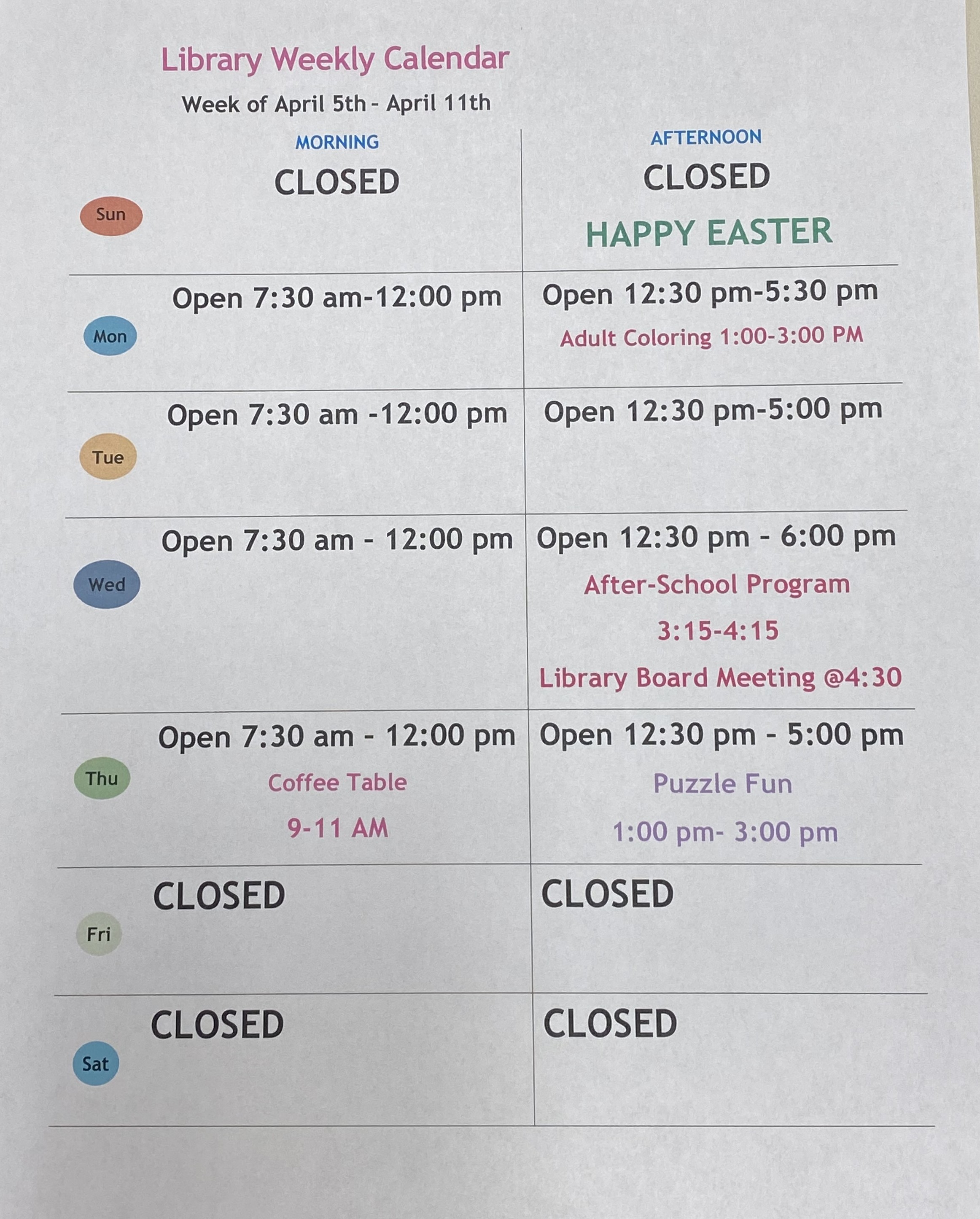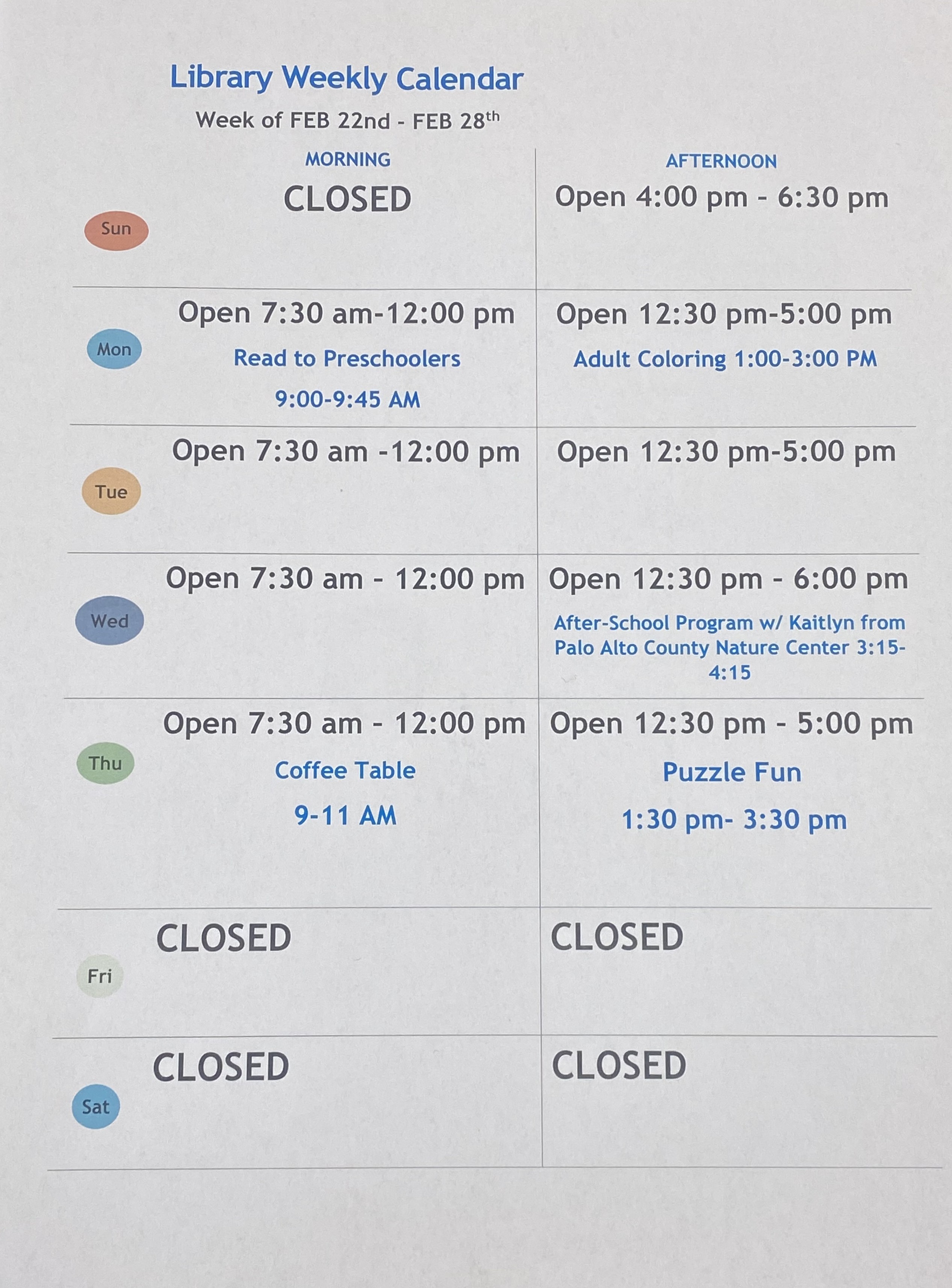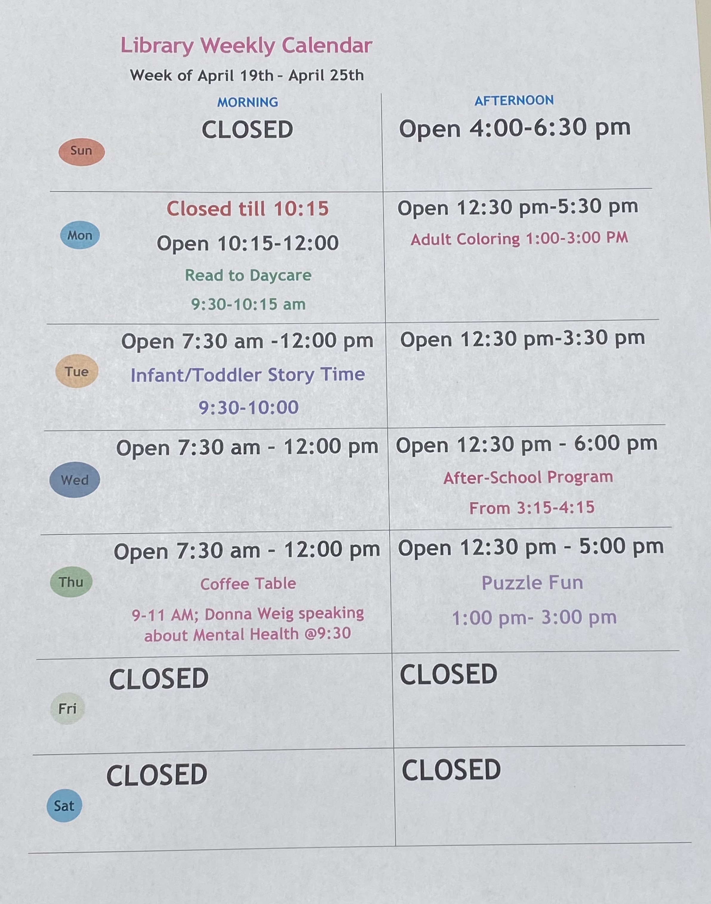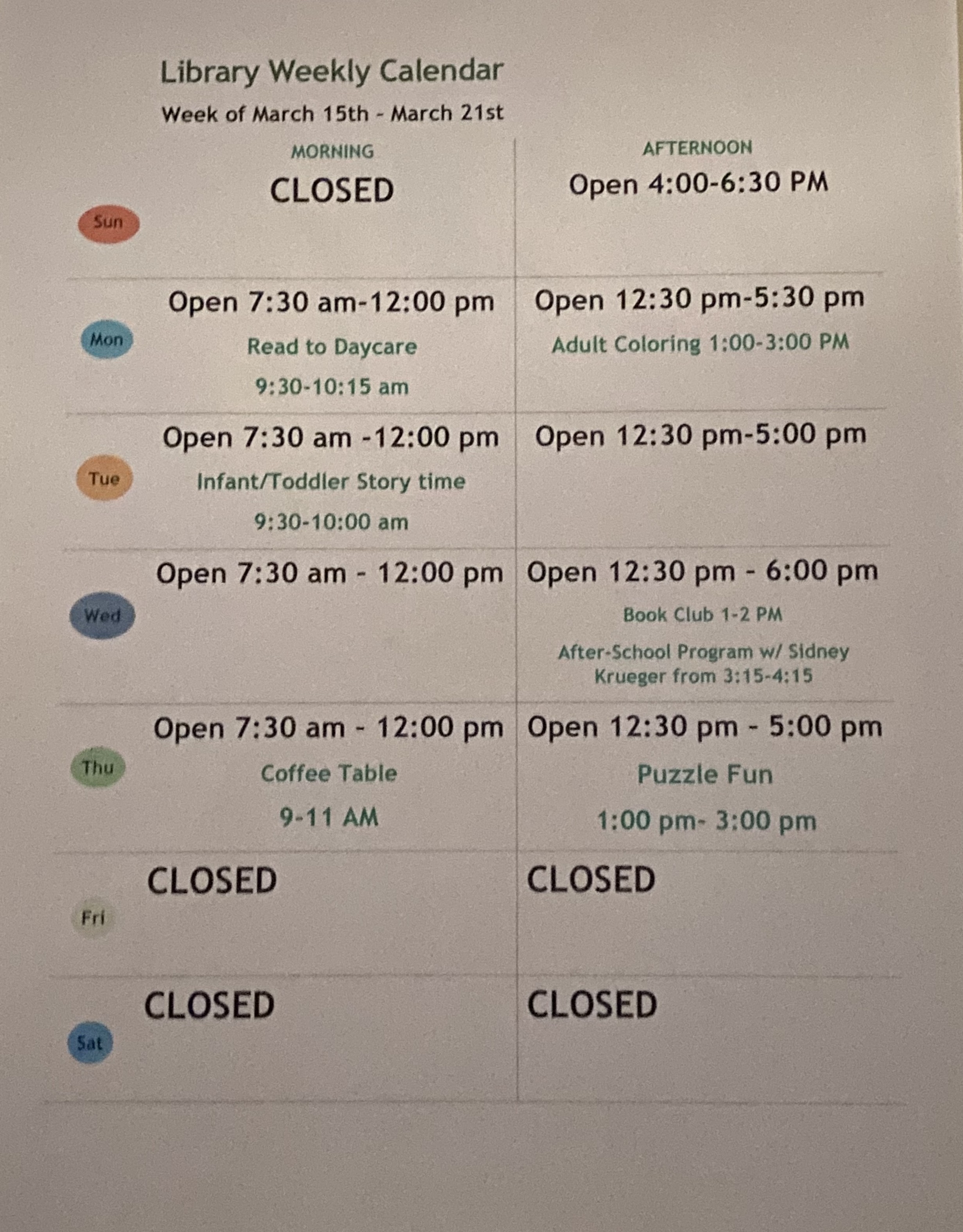 If you have questions, feel free to call the library anytime. Don’t forget to visit our Facebook page, website, or the front door for the latest library hours and updates. We can’t wait to see you!