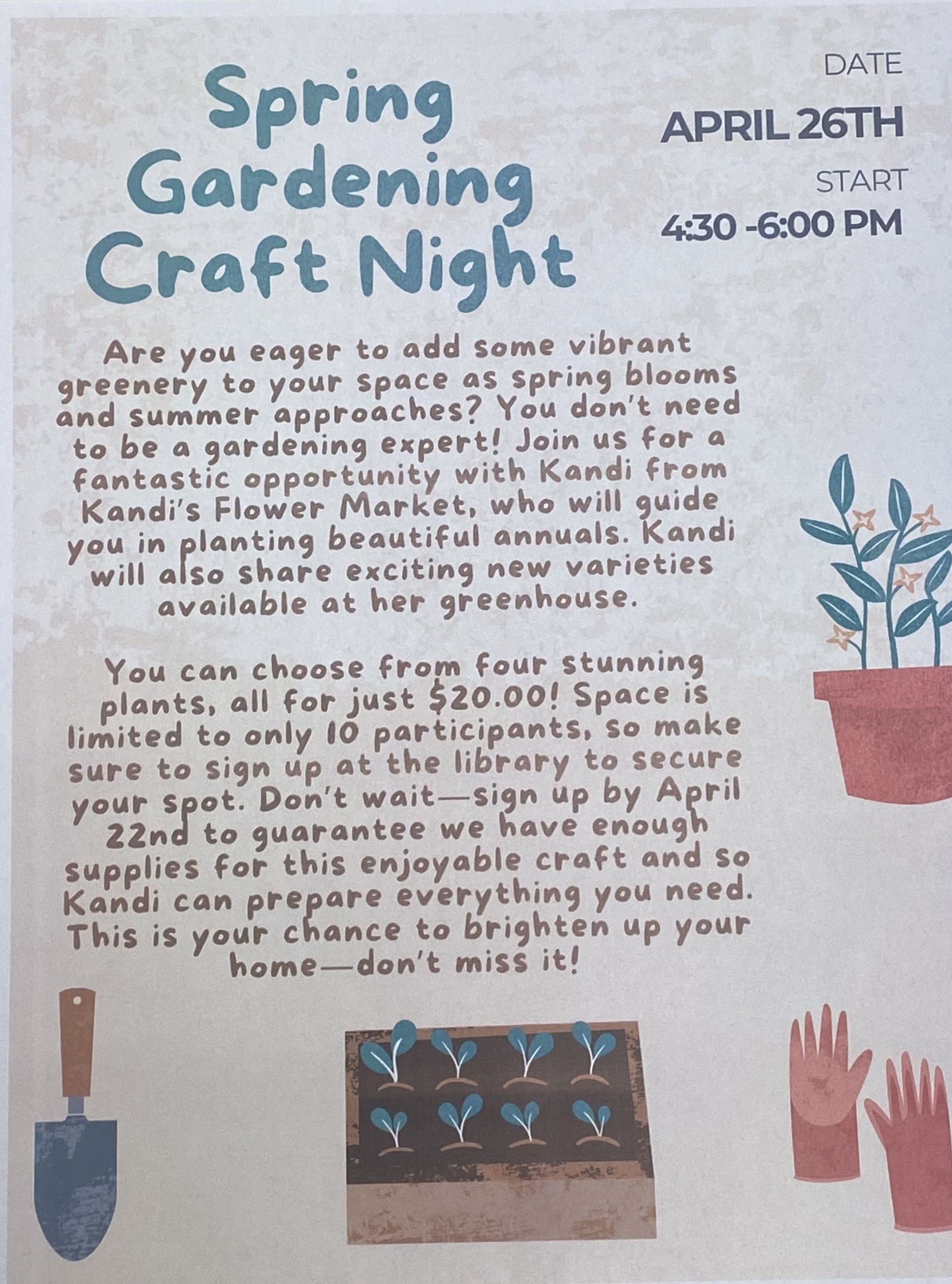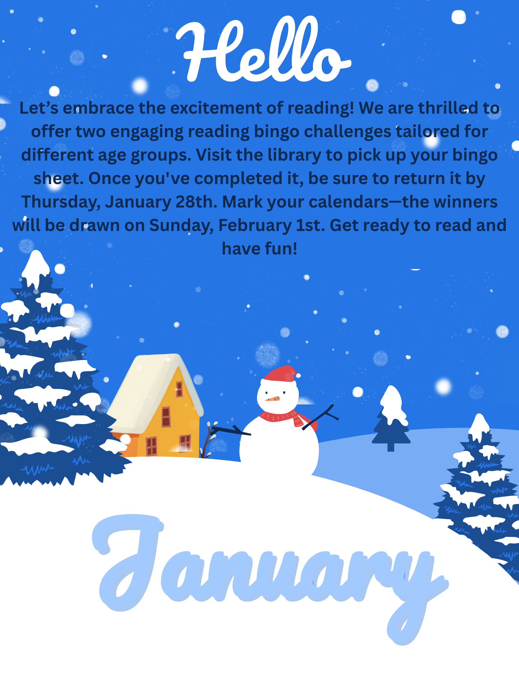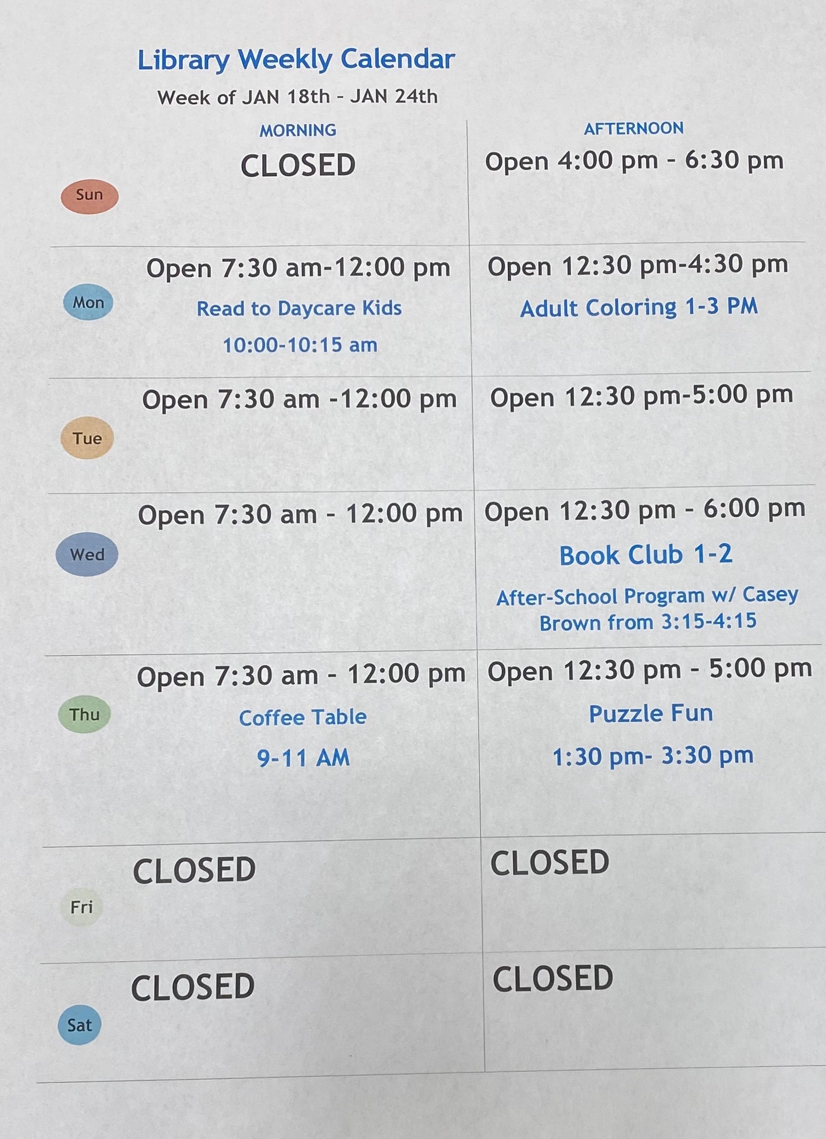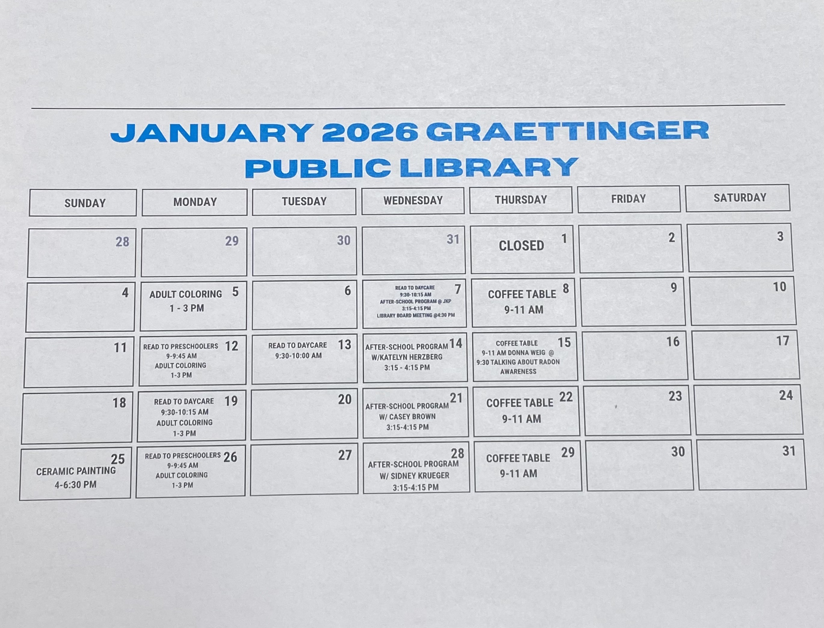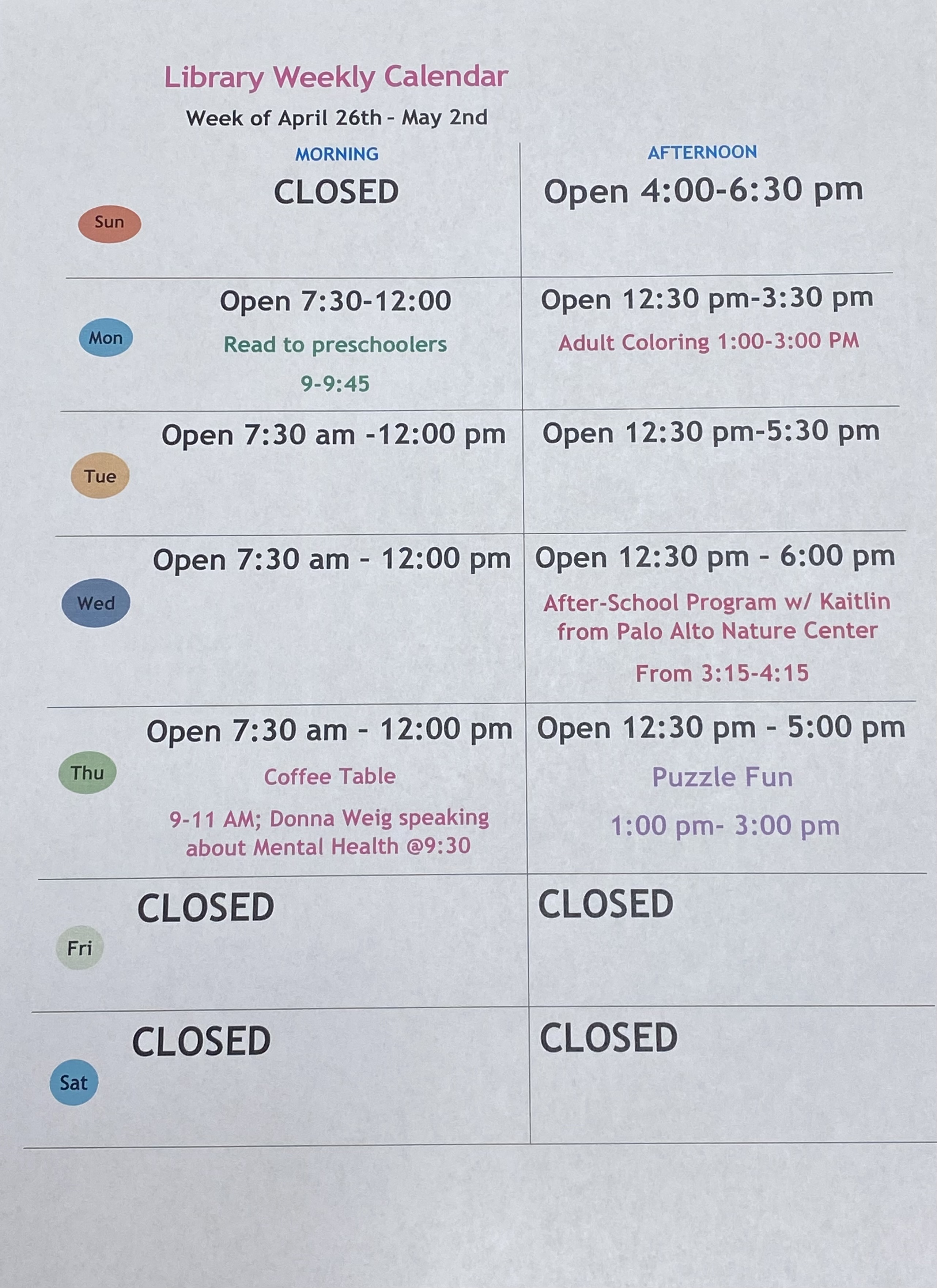 If you have questions, feel free to call the library anytime. Don’t forget to visit our Facebook page, website, or the front door for the latest library hours and updates. We can’t wait to see you!