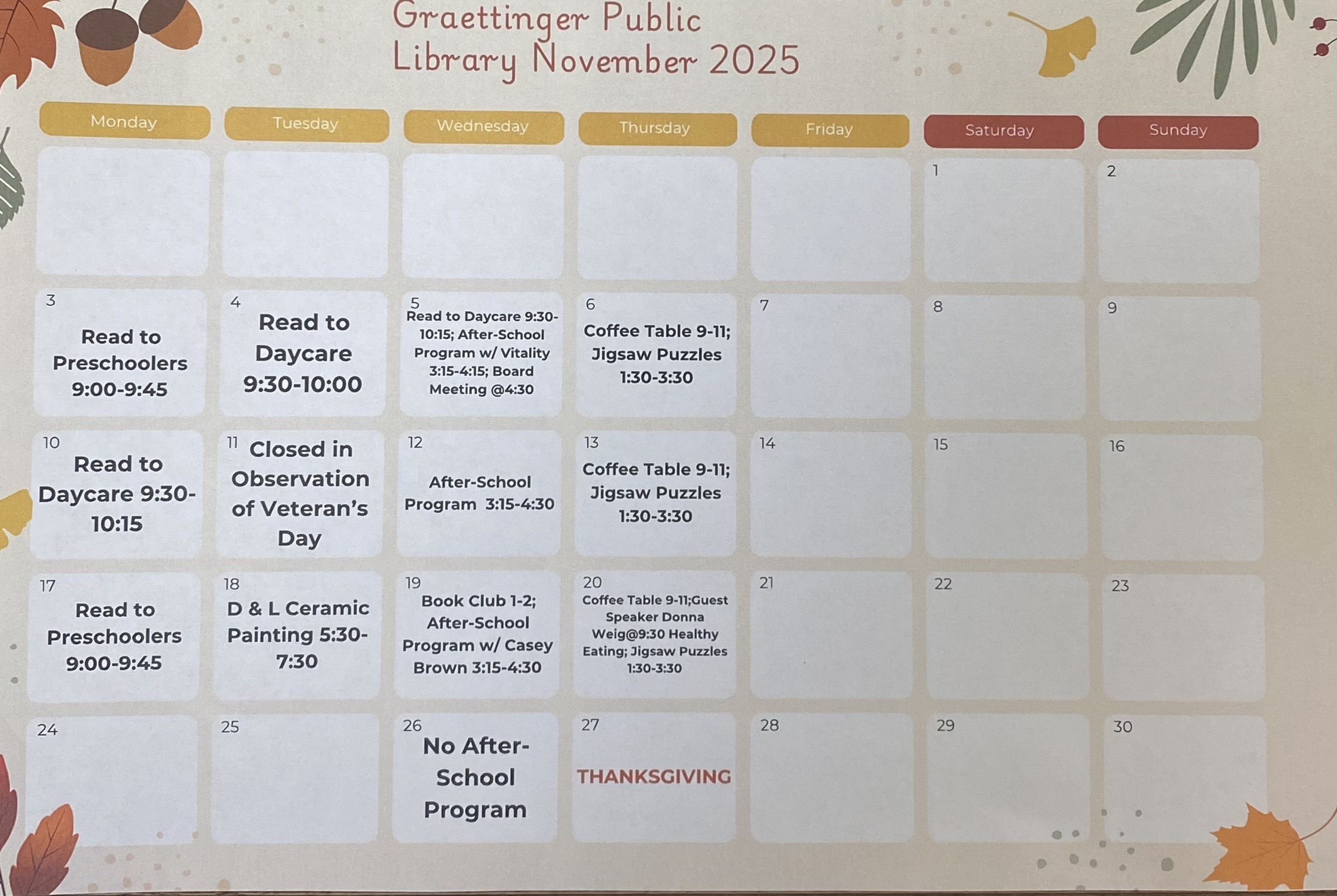 Check out the monthly calendar below to see all the exciting events happening at the library in November. On the left side of the page, you will find our weekly calendar, the word of the week, monthly challenges and flyers for any upcoming events.